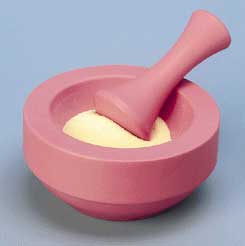 Sapphire Mortar and Pestle^ Made of finely powdered synthetic sapphire and a specially processed form of pure aluminum oxide. Inert to most corrosive chemicals. Volume: 49.3ml. Height: 38mm. Depth: 24mm. 85mm OD. 65mm ID. Pestle: 70mm. Specific gravity: 3.6. Hardness: spproximately 9 on Mohs scale.