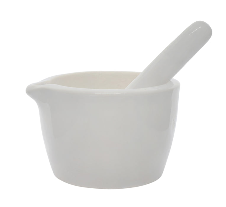 Single, heavy duty Mortar and Pestle set with a 5oz (150ml) capacity. Perfect for grinding and crushing powders, pills, pigments and more. High walls prevent material from spilling out while being crushed. Mortar and pestle are both made of solid porcelain. Resistant to chips and cracks. Inside grinding surface of mortar and the rounded end of the pestle are unglazed for precise grinding and crushing. Mortar features a contoured spout for pouring and transferring of crushed material. Mortar measures 3.7" wide and 3" tall. Pestle measures 4.7" in length and the rounded end measures 1.2" in diameter.