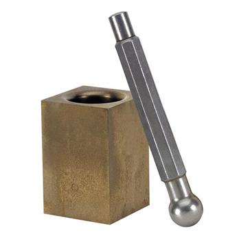 Made of hardened alloy tool steel. Pestle has ball-end to fit bottom of mortar cavity. Mortar: 3 x 3 x 4-1/2 "H (76 x 76 x 114mm); bore: 2 " dia x 3 " deep (51 x 76mm). Pestle: 9-1/2 " (241mm) overall length. Shipping. wt. 16 lbs. (7.3kg)