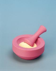 Sapphire Mortar and Pestle^ Made of finely powdered synthetic sapphire and a specially processed form of pure aluminum oxide. Inert to most corrosive chemicals. Volume: 111ml. Height: 50mm. Depth: 38mm. 122mm OD. 100mm ID. Pestle: 100mm. Specific gravity: 3.6. Hardness: approximately 9 on Mohs scale.