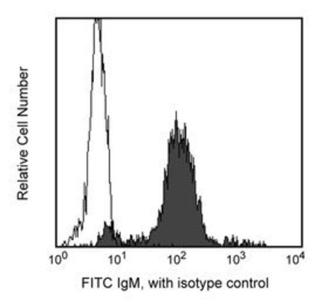 The G53-238 antibody reacts specifically with rat IgM monomers and pentamers. It does not react with other Ig isotypes. G53-238 antibody has not been shown to stimulate B-cell proliferation.Host Species: MouseClone: G53-238Isotype: IgG1, κSpecies Reactivity: RatImmunogen: Pooled rat IgELISA, Flow Cytometry