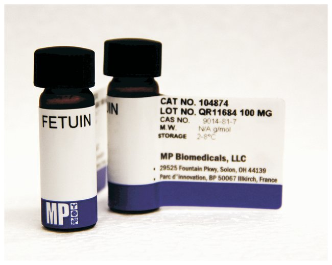 Formulation: Polypeptide 74%, Hexose 8.3%, Hexosamines 5.5%, and Sialic Acid 8.7%Applications:Fetuin bovine is a Protein with the ability to bind to the insulin receptor and inhibit insulin action, Fetuin has been used in studies of type 2 diabetes mellitus (T2DM), In patients with T2DM, fetuin has been shown to be significantly lower when compared to control patients.