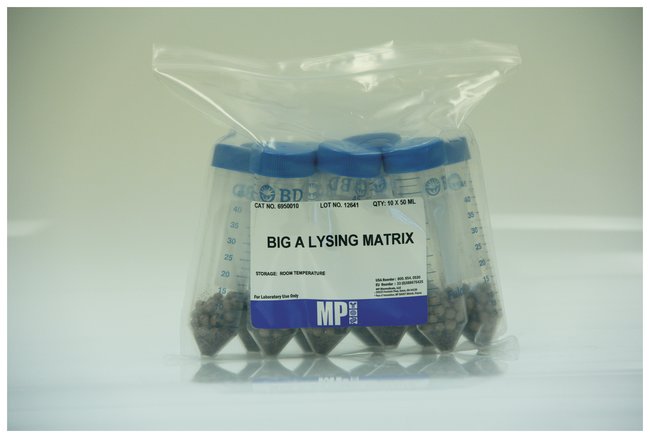 Contains 0.1mm silica spheres. Used primarily for lysis of gram positive and gram negative bacteria, and will also disrupt fungal tissue and spores. Lysing Matrix B can also be used as an additive for disruption by sonication.
