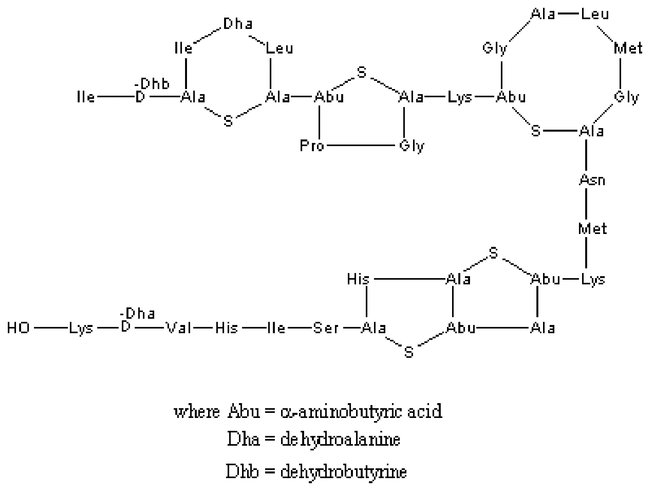 Nisin, Nisin content: 2.5% Remainder is NaCl and milk solids (denatured), Each
