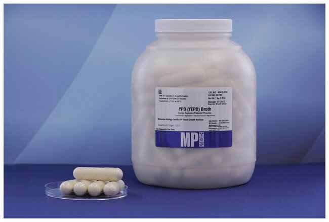Contains dextrose, peptone, and yeast extractPre-measured capsulesFormulationUse 10 large capsules per literContents/liter: 20g peptone, 10g yeast extract, 20g dextrose pH 6.5 at 30°CYeast Cell Culture