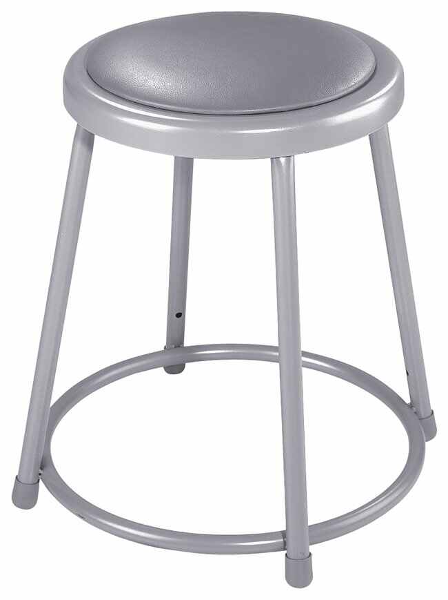 Available with adjustable height, backrest features and choice of seat shape.Sturdy 0.875 in. (2.2cm), 18-gauge steel tubingMetallic gray with gray vinyl paddingRound seats are 14 in. (35.6cm) wide with 11.5 in. (29.2cm), 0.5 in. (1.3cm) vinyl pad, riveted through seat pan Selected models feature 6 × 12 in. (15.2 × 30.5cm) backrest that moves front/back and up/downChoice of three standard heights or three adjustable heightsNonmarring floor guidesNonswivel StoolsFour legs, with 0.625 in. (1.6cm) foot ring welded at each leg point Swivel Stool360° swivel seat with backrestAdjustable height: 24 to 28 in. (61 to 71.1cm)