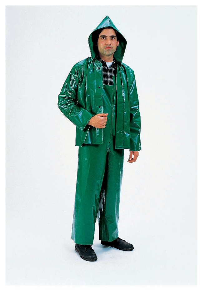 Protects against acids, caustics and many other chemicals. 13 oz. per sq. yd. Flame retardant.Coveralls have attached hood, zipper and snap front closure with storm flap30 in. long (76cm) jacket features snap on collar for detachable hood, front snap closure and storm flapBasic bib style overalls have elastic suspendersSeams are double welded for maximum protection and wearAll garments are greenOrder InfoChoose from coveralls, jacket, hood and bib overalls (each available separately).
