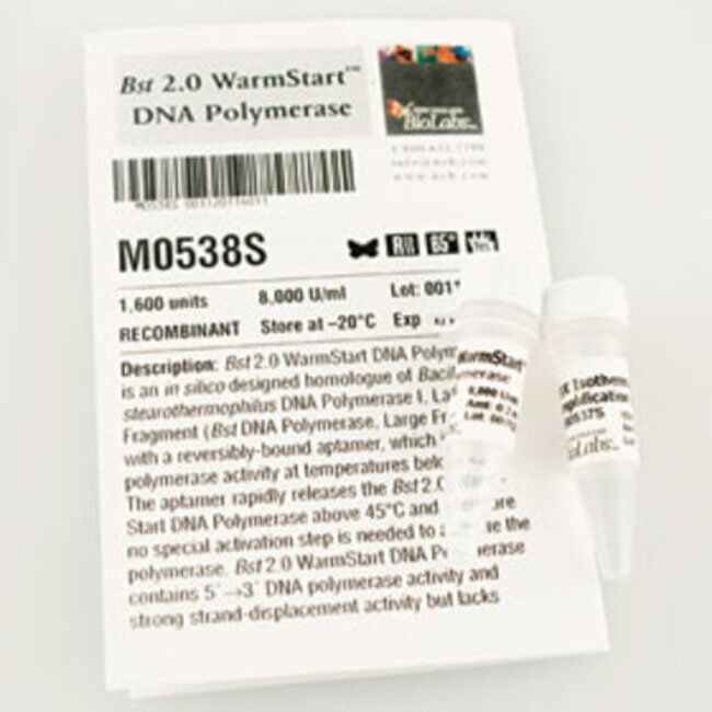 Bst 2.0 WarmStart DNA Polymerase - 1,600 units. Bst 2.0 WarmStart DNA Polymerase is an in silico designed homologue of Bacillus stearothermophilus DNA Polymerase I, Large Fragment (Bst DNA Polymerase, Large Fragment) with a reversibly-bound aptamer, which inhibits polymerase activity at temperatures below 45C. The aptamer rapidly releases the Bst 2.0 WarmStart DNA Polymerase above 45C and therefore no special activation step is needed to activate the polymerase. Bst 2.0 WarmStart DNA Polymerase contains 5-3 DNA polymerase activity and strong strand-displacement activity but lacks 5-3 exonuclease activity. Bst 2.0 WarmStart DNA Polymerase displays improved amplification speed, yield, salt tolerance, and thermostability compared to wild-type Bst DNA Polymerase, Large Fragment.