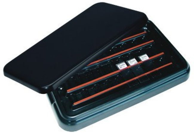 IHC staining tray with black lid. Four plastic rails covered with a polymer strip perfectly hold slides, even when the tray is held at an angle.