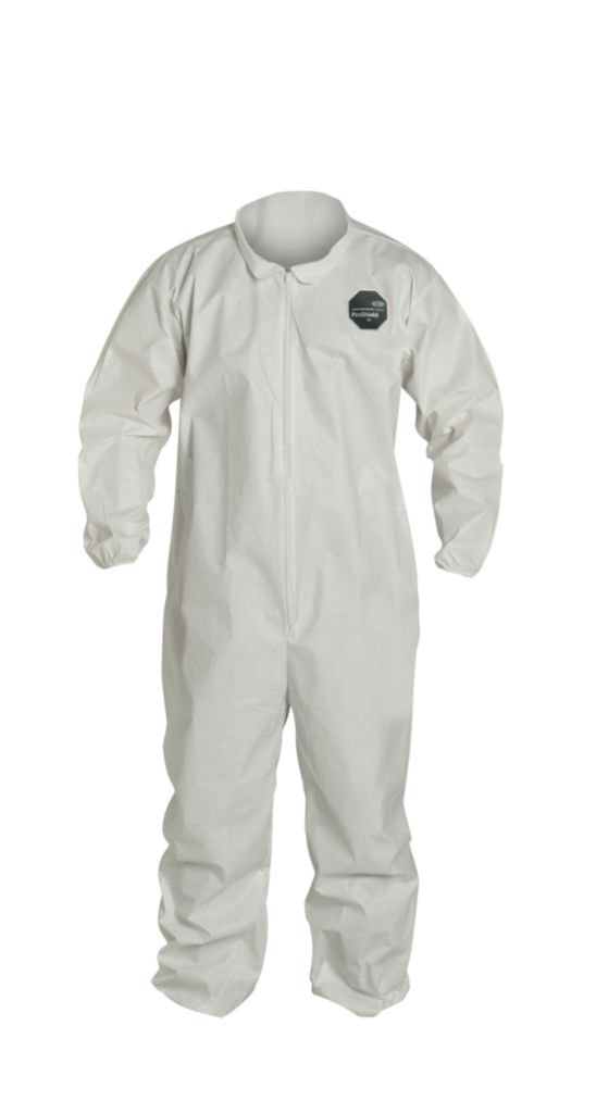 DuPont* ProShield* NexGen* Coveralls^ Disposable polypropylene coveralls protect against a variety of common industrial aerosols and liquids. Elastic wrists and ankles, collar, serged seams, and front zipper closure. Bulk packed. White. Size: XX-Large.