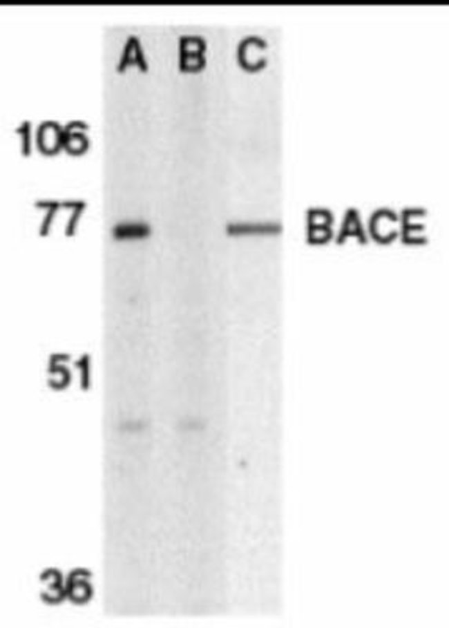 A blocking peptide containing 17 amino acids near the carboxy terminus of human BACE. Source: Synthetic (Accession #: AF190725) The BACE-1 Blocking Peptide has been validated for the following applications: Antibody Competition.