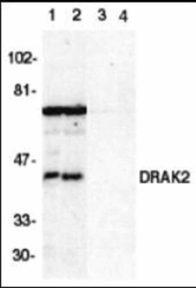 A blocking peptide containing 15 amino acids near the carboxy terminus of human DRAK2. Source: Synthetic (Accession #: AB011421) The DRAK2 Blocking Peptide has been validated for the following applications: Antibody Competition.