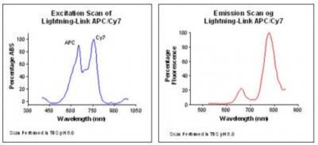 APC/Cy7 is a tandem conjugate. In the Lightning-Link APC/Cy7 the tandem is excited at 633nm, wavelength at which the APC has its maximum absorption. The excited APC functions then as an energy donor, where the energy is transferred via FRET (Fluorescence Resonance Energy Transfer) to the Cy7. The Cy7 emits then the energy received from the APC in the form of long wavelength light at 776nm.Order InfoQuantity