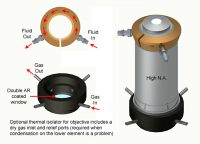 Objective cooling collar^ Objective cooling collar, A ring shaped attachment to an objective that provides an isolated pathway through which a refrigerated fluid can flow to provide an efficient means of cooling the objective.