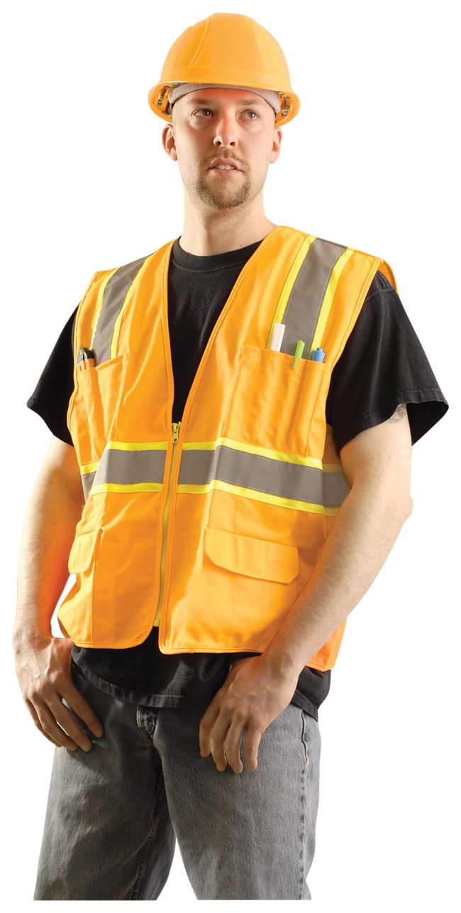 Surveyor's Vest100% polyester tricotTwo-tone striping with 2 in. wide (5.1cm) silver reflective tapeSurveyor-style front pocketsLarge arm holesZipper closureColor: YellowStandard VestBright, lightweight polyester tricot fabric2 in. wide (5.1cm) strip of 3M™ Scotchlite™ reflective material—two 360° horizontal stripes and two vertical shoulder stripesHook-and-loop closureMachine-washableColor: YellowComplianceMeet ANSI™/ISEA 107-2010 standards.