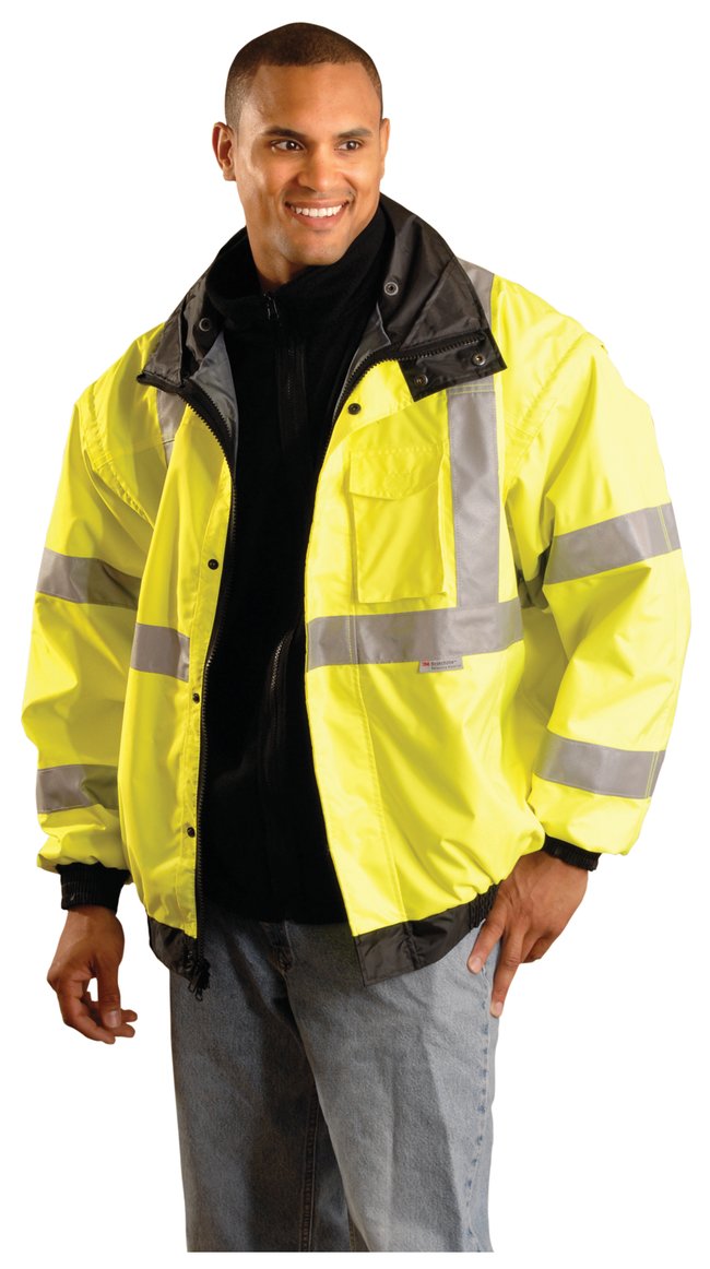 Weather-resistant PVC-coated polyester with inner nylon liner and removable poly-fleece inner jacket.Fluorescent yellow with dark cuffs, collar, and waistband2 in. wide (5.1cm) 3M™ Scotchlite™ reflective material—one 360° horizontal, two vertical stripes, and four 360° horiztonal sleeve stripesSnap-on hideaway hood and flip-up collarZipper-and-snap front with radio pocket and two outside hand pocketsElasticized cuffs and waistbandRemovable outer jacket sleevesInner nylon jacket liner features double inside pockets, one with zipperWearing OptionsWear as two-layer ANSI™ Class III jacket by removing the inner polar fleece jacketWear as a ANSI Class II vest by removing outer sleeves, keeping inner fleece jacket with fleece sleevesWear as a ANSI Class II sleeveless outer vest with reflective striping by removing the inner polar fleece jacket lining with sleevesWear the inner polar fleece jacket alone on cool daysComplianceMeets ANSI/ISEA 107-2010 standards.