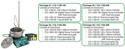 Convenient Combination Package #1^ BATHS, OIL. Consists of one each CG-1100-01 100 x 50mm Oil Bath, one each CG-15001-20 Digital Temperature controller with Thermocouple, one each CG-1100-10 Thermocouple Clip and one quart of CG-1100-30 Bath Oil.