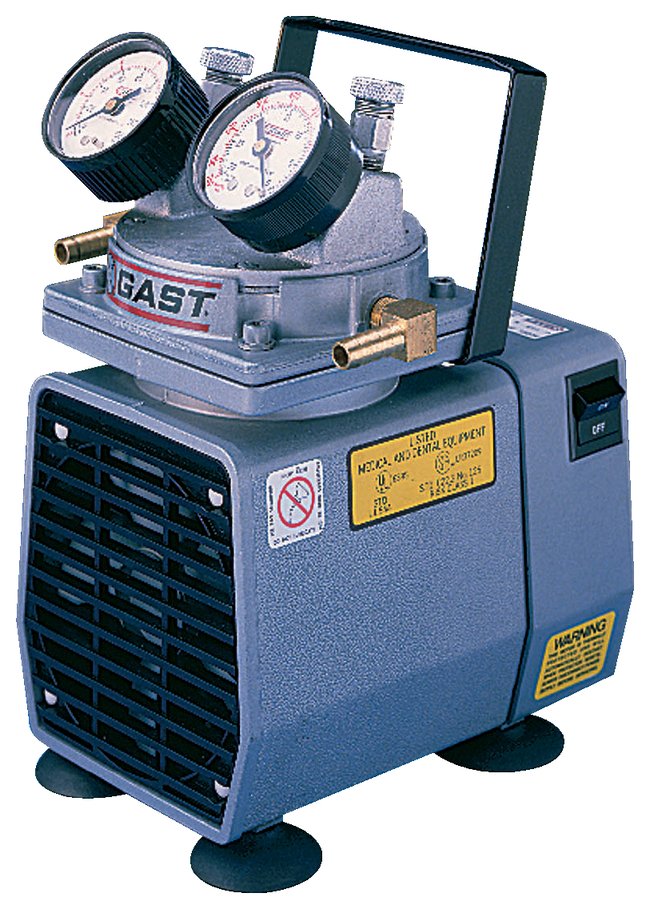 Easily transport this lightweight diaphragm pump from class to class for demonstrations. Includes separate vacuum and pressure regulators graduated from 0 to 60psig and 0 to 25 in.Hg. Features aluminum housing with rubber feet, handle, built-in switch, cord and plug.Specifications:Free air displacement: 31.15L/min.Pump speed: 1725rpmPressure: 60psigVacuum: 25 in.HgMotor: 1/8hp 115V 60HzHose connection takes 0.25 in. (0.6cm) I.D. tubingDimensions: 10.75H × 7.75L × 6.5 in.W (27.3 × 19.7 × 16.5cm)Weight: 15 lb. (6.8kg)