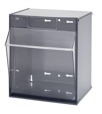 Bin^ Space saving bin unit keeps small and medium sized parts organized, sorted, Clear and break resistant plastic containers tip open to a 45 degree angle and completely removable, Gray frame, Dimension(LxWxH): Outside: 11 3/4 x 11 13/16 x 13 7/8 Inch, Bin: 8-7/8 x 11-1/16 x 13-5/8 Inch