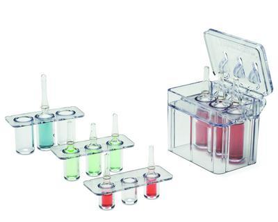 Break-Safe* Ampule Opener^ Cleanly opens up to 3 ampules at a time while keeping hands safe. all glass shards stay safely contained in the device until ready to dispose. includes 4 inserts that hold 1, 2, 3, 5, or 10ml ampules. clear copolyester plastic is durable and chemical resistant.