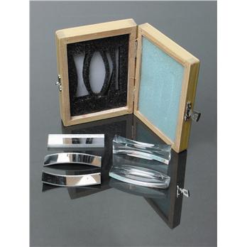Includes two acrylic lenses, one each of double convex, and double concave, and three mirrors, one each of convex, concave and plane. Packed in a cushioned wood storage box.