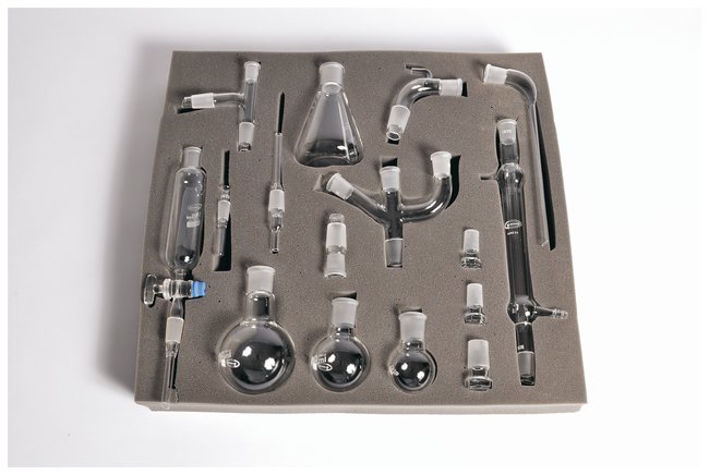 The standard set is designed to cover essential requirements for organic chemistry and is suitable for preparations up to 30g. All glassware is jointed (joint sizes available upon request). The deluxe set is suitable for preparations up to 150g. Both sets come in a sturdy, form fitting case.Standard Organic Chemistry Glassware Kit (9 piece):1 Pear-Shaped Flask (50ml); 1 still head; 1 Liebig condenser; 1 screw cap adapter; 1 receiver adapter; 1 air leak/steam inlet tube; 1 dropping funnel (50 ml with Rotoflo tap); 1 stopper; 1 thermometerDeluxe Organic Chemistry Glassware Kit (16 piece):1 Still Head (14/23); 1 Receiver (19/26 )/Cone (14/23); 1 Air Leak / Steam Inlet Tube (14/23); 1 Liebig Condenser (19/26); 1 Dropping Funnel (100ml); 1 Reducing Adapter; 1 Multiple Adapter; 1 Round Bottom Flask (50ml); 1 Round Bottom Flask (100ml); 1 Round Bottom Flask (250ml); 1 Erlenmeyer Flask (250ml); 1 Stopper; 3 Thermometer Pocket; 1 Receiver Adapter