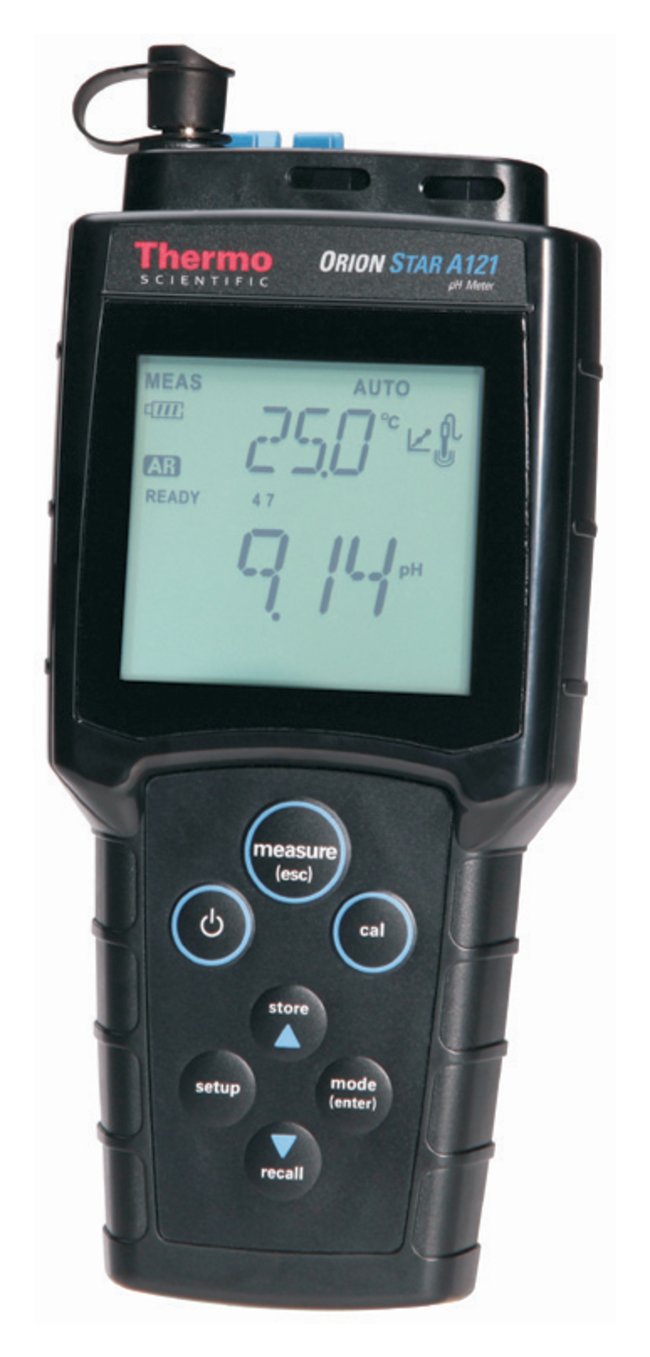 Thermo Scientific Orion Star A121 pH Portable Meters combine simplicity with accuracy. A large LCD displays pH or mV readings along with temperature. Icons provide quick updates on battery life, electrode status and calibration information. Simple button layout and onscreen messages help with calibration and setup menu choices.Large, informative screen clearly shows the main information, including pH or mV reading, temperature in °C or °F, meter mode, calibration information and battery lifeDon't miss a reading - Auto-Read measurement mode locks in the stable reading on your screen and ready indicator alerts when readings are stableUp to 3 point pH calibrationAutomatic recognition of USA/NIST and DIN buffersEasily recall calibration slope data for procedure checksNon-volatile memory holds up to 50 data pointsFour AA batteries (included) provide over 2000 hours of operation or purchase the universal power adapter (sold separately) to run meter on AC powerPerfectly portable, waterproof and protected to take anywhere with a IP67-rated housing3 year meter replacement warrantySpecificationsAccuracy (mV): ±0.2 mV or ±0.05% of reading whichever is greaterAccuracy (pH): ±0.01pHBattery Life: 2000 hoursInputs: BNC (pH), 8-pin Mini-DIN (temperature)Probe Type: ±pH electrode, ATC probe, ORP electrode - purchase separatelyRange (mV): 1600.0mVRange (pH): -2.00 to 16.00pHRelative Humidity Range: 5 to 85 %, non-condensingResolution (mV): 0.1mVResolution (pH): 0.1, 0.01pHTemperature (Metric) Operating: 5 to 45°CTemperature Range: -5° to 105°CCalibration Points (pH): 1 to 3CertificationsIP-67, CE, TV, FCC Class A limitsWarranty and ServicesThree-year meter replacement warranty