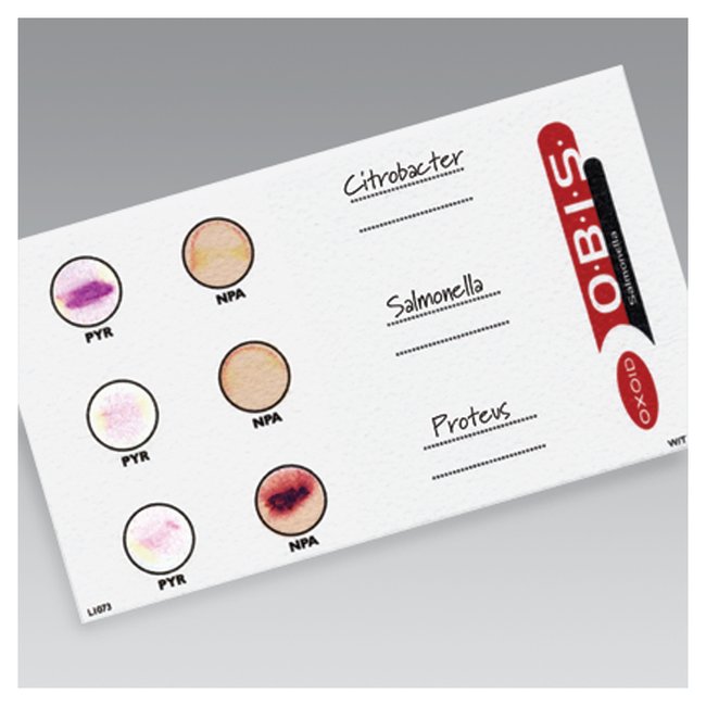 Rapidly differentiate Campylobacter, Helicobacter and Acrobacter species from other Gram-negative organisms with Thermo Scientific™ Oxoid™ Biochemical Identification System (O.B.I.S.) campy. This rapid colorimetric test delivers simple and rapid results for the detection of L-alanyl aminopeptidase in Gram-negative organisms. It has been designed for the differentiation of Campylobacter, Helicobacter, and Arcobacter species from other Gram-negative organisms and incorporates a Gram-lysis test which will demonstrate Gram status.Use O.B.I.S. campy for rapid differentiation of species of Campylobacter, Helicobacter, and Arcobacter from all other Gram-negative organisms1.Simple—easy to implementRapid—results in 6 minutes of testing suspect coloniesThe O.B.I.S. campy test differentiates species of Campylobacter, Helicobacter, and Arcobacter from all other Gram-negative organisms1. Unlike other Gram-negative organisms, Campylobacteraceae do not possess the enzyme L-alanyl aminopeptidase (L-ALA). The O.B.I.S. campy test incorporates a rapid test to detect this enzyme and a Gram-lysis reagent to rapidly determine the Gram status. First, the Gram-lysis test (or a Gram stain) must be carried out. This test differentiates between Gram-positive and Gram-negative bacteria2.Not all products are available for sale in all territories. Please inquire.Remel™ and Oxoid™ products are now part of the Thermo Scientific brand.