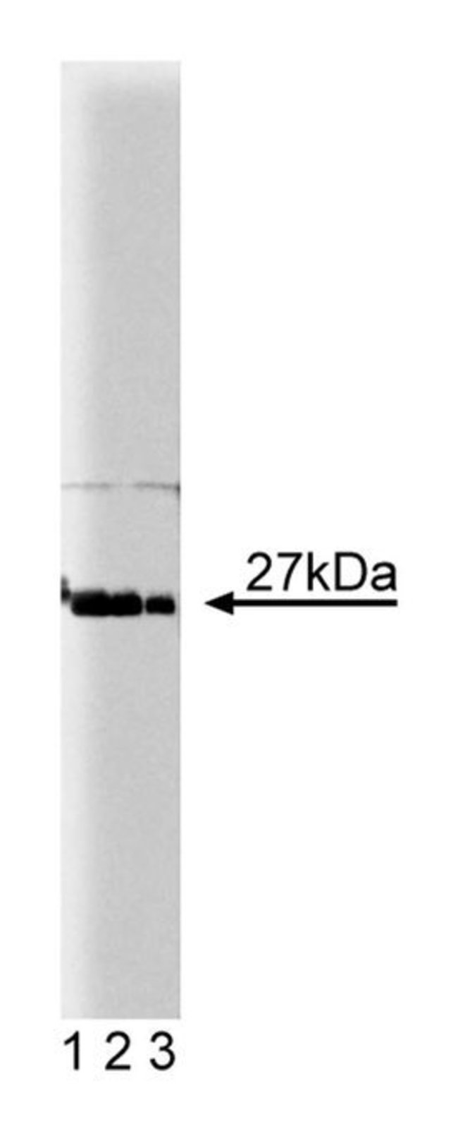 Kip1 is a cyclin-dependent kinase (cdk) inhibitor that was identified as a result of its role in TGFβ-induced G1 phase arrest and cell-cell contact. In vitro , p27 [Kip1] binds tightly to Cyclin D-Cdk4, Cyclin E-Cdk2, and Cyclin A-Cdk2 complexes and inhibits their activity. In normal cells, Kip1 is sequestered and its activity gradually decreases as cells reach S phase. The addition of TGF-β in early G1 blocks this decline in activity, by preventing the sequestration of Kip1. TGF-β also reduces the levels of Cdk4. Kip1 preferentially binds Cyclin D-Cdk4, but the lower levels of Cdk4 in TGF-β treated cells allow Kip1 to be available for binding to Cyclin E-Cdk2 and Cyclin A-Cdk2. Kip1 is structurally related to Cip1/WAF1, having a similar 60 amino acid sequence in the N-terminal region. A 52 amino acid Kip1 peptide (residues 28-79) from this region is sufficient to inhibit cdk activity in vitro.Immunofluorescence, Immunohistochemistry, Immunoprecipitation, Western Blotting