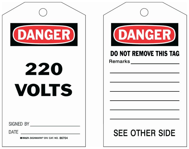 Paper Cardstock Tag: DANGER 220 VOLTS SIGNED BY: DATE:, Pack of 100