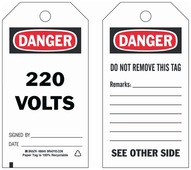 Paper Cardstock Tag: DANGER 220 VOLTS SIGNED BY: DATE:, Pack of 100