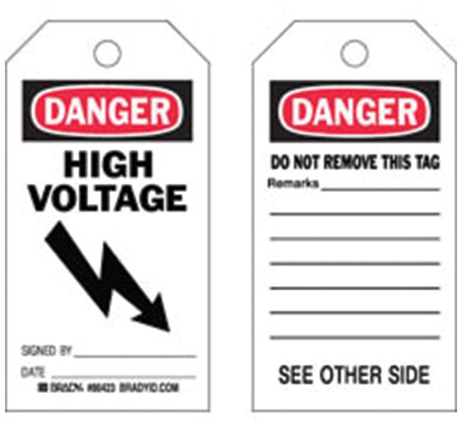 Paper Cardstock Tag: DANGER HIGH VOLTAGE SIGNED BY: DATE:, Pack of 100