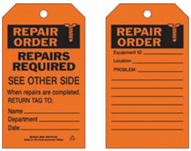 Identify facility equipment to your exact specifications. Brady™ Paper Cardstock Tags REPAIR ORDER are durable two-sided tags with a write-on area that accepts most marking pens.