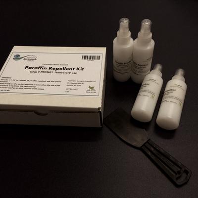 Paraffin repellent kit^ Paraffin repellent kit, Prevents waxfrom sticking to painted or textured surfaces, use as an effective mold release, as well as to clean up waxfrom instruments and counter tops. All natural and non-toxic. Cucumber Melon scented. Include four bottles and one scraper, 4x4oz