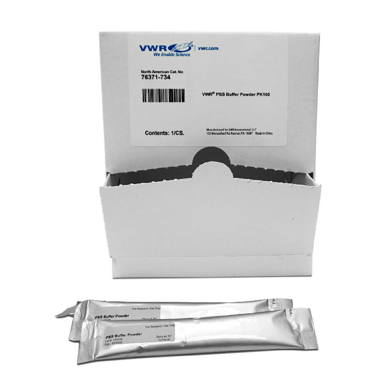 VWR® Buffer Powder Packs can save time and money, as there is no need to measure and weight many separate chemical components which is required when making buffers from scratch., VWR® Pre-measured buffer packs are extremely easy to use and are formulated so each pack makes 1 Liter of 1X buffer. Simply tear open a pack and mix completely with 1 liter of distilled water., 04_BodyText: Shipping costs are also minimal, as each case of 50 or 100 packs is compact and weighs only 2.5 Lbs., 02_BulletPoint: Buffer powder quickly dissolves to make 1L of 1X solution | No weighing or measuring of separate components | No pH adjustments required | Economical shipping, long shelf life | Quality and consistency guaranteed, 08_Certifications: COA avaialble for each lot number, 12_Packaging: Each case of buffer packs is packaged in a convenient dispenser box, which takes up very little lab space. Included in each case is an instruction insert, and a roll of stickers to label each container of prepared buffer solution., Final SAP Desc Link: 17076431, SAP Description Status: Ready, VWR® Buffer Powder Packs can save time and money, as there is no need to measure and weight many separate chemical components which is required when making buffers from scratch., VWR® Pre-measured buffer packs are extremely easy to use and are formulated so each pack makes 1 Liter of 1X buffer. Simply tear open a pack and mix completely with 1 liter of distilled water., 04_BodyText: Shipping costs are also minimal, as each case of 50 or 100 packs is compact and weighs only 2.5 Lbs., 02_BulletPoint: Buffer powder quickly dissolves to make 1L of 1X solution | No weighing or measuring of separate components | No pH adjustments required | Economical shipping, long shelf life | Quality and consistency guaranteed, 08_Certifications: COA avaialble for each lot number, 12_Packaging: Each case of buffer packs is packaged in a convenient dispenser box, which takes up very little lab space. Included in each case is an instruction insert, and a roll of stickers to label each container of prepared buffer solution., VWR® PBS Buffer Powder, Size: 100 pks, Cat. No.: 76371-734, pH: 7.2 - 7.6, Formulation: 137 mM NaCl, 2.7 mM KCl, 10mM phosphate, Final SAP Desc Link: 17076431, SAP Description Status: Ready