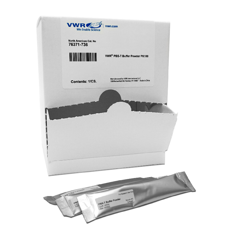 VWR® Buffer Powder Packs can save time and money, as there is no need to measure and weight many separate chemical components which is required when making buffers from scratch., VWR® Pre-measured buffer packs are extremely easy to use and are formulated so each pack makes 1 Liter of 1X buffer. Simply tear open a pack and mix completely with 1 liter of distilled water., 04_BodyText: Shipping costs are also minimal, as each case of 50 or 100 packs is compact and weighs only 2.5 Lbs., 02_BulletPoint: Buffer powder quickly dissolves to make 1L of 1X solution | No weighing or measuring of separate components | No pH adjustments required | Economical shipping, long shelf life | Quality and consistency guaranteed, 08_Certifications: | COA available for each lot number. |, 12_Packaging: Each case of buffer packs is packaged in a convenient dispenser box, which takes up very little lab space. Included in each case is an instruction insert, and a roll of stickers to label each container of prepared buffer solution., Final SAP Desc Link: 17076431, SAP Description Status: Ready, VWR® Buffer Powder Packs can save time and money, as there is no need to measure and weight many separate chemical components which is required when making buffers from scratch., VWR® Pre-measured buffer packs are extremely easy to use and are formulated so each pack makes 1 Liter of 1X buffer. Simply tear open a pack and mix completely with 1 liter of distilled water., 04_BodyText: Shipping costs are also minimal, as each case of 50 or 100 packs is compact and weighs only 2.5 Lbs., 02_BulletPoint: Buffer powder quickly dissolves to make 1L of 1X solution | No weighing or measuring of separate components | No pH adjustments required | Economical shipping, long shelf life | Quality and consistency guaranteed, 08_Certifications: | COA available for each lot number. |, 12_Packaging: Each case of buffer packs is packaged in a convenient dispenser box, which takes up very little lab space. Included in each case is an instruction insert, and a roll of stickers to label each container of prepared buffer solution., VWR® PBS-T Buffer Powder, Size: 100 pks, Cat. No.: 76371-736, pH: 7.2 - 7.6, Formulation: 137 mM NaCl, 2.7 mM KCl, 10mM phosphate, 0.05% Tween-20, Final SAP Desc Link: 17076431, SAP Description Status: Ready