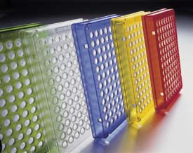 Eppendorf* twin.tec* 96-Well PCR Plates^ Polypropylene wells, polycarbonate plate deck and skirt. Cut-away corner, alphanumeric grid. Autoclavable. Certified free of DNA, DNase, RNase, and PCR inhibitors. PCR is a patented process of Hoffmann-La Roche; requires license. Semi-skirted. Color: blue.