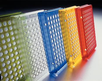 Eppendorf* twin.tec* 96-Well PCR Plates^ Polypropylene wells, polycarbonate plate deck and skirt. Cut-away corner, alphanumeric grid. Autoclavable. Certified free of DNA, DNase, RNase, and PCR inhibitors. PCR is a patented process of Hoffmann-La Roche; requires license. Skirted. Color: yellow.