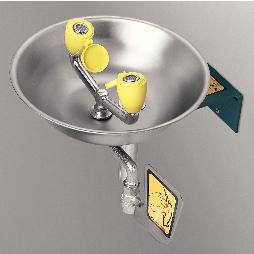 Pedestal Mounted Eye Wash^ Eye wash flushes liquid and dust contaminants from eyes. Designed with stainless steel receptor, activated by stainless steel push handle. Features twin spray heads, stay-open ball valve. Releases 2.5 GPM aerated water. Meets ANSI Z358.1-1990 standard.