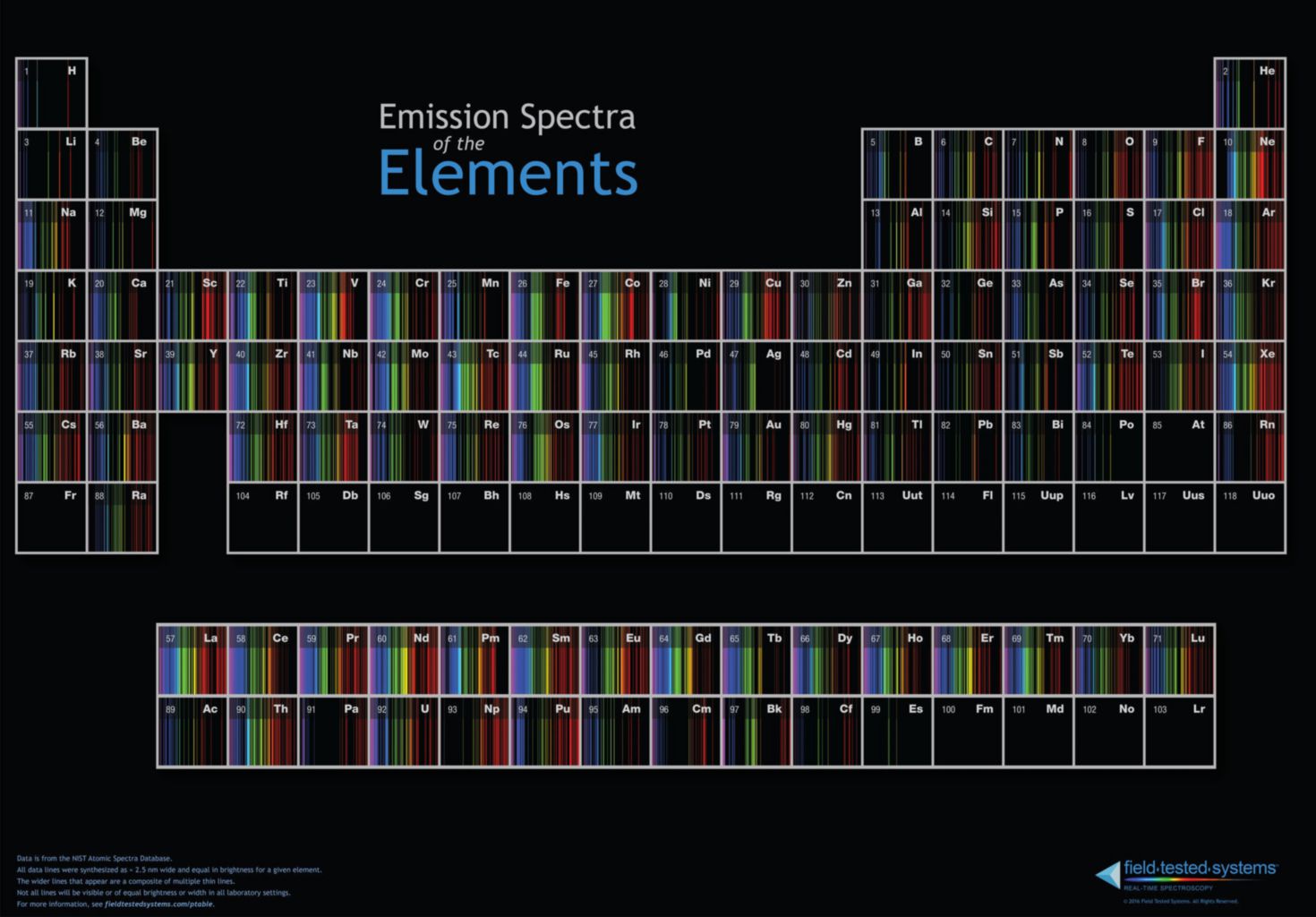 Periodic Table Of Spectra 24 X 36In^ Periodic Table Of Spectra Makes It Clear To Students That Each Element Has Its Own Spectral Fingerprint, Poster Heading: Emission Spectra Of Elements, Size: 24 X 36I