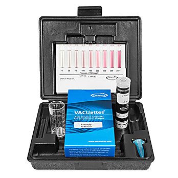 Phenol (hydroxybenzene) is the simplest of a group of similar organic chemicals, which includes cresols, xylenols, and catechols. Phenol itself is a common ingredient of disinfectants. In drinking water, low-level phenolic concentrations impart a foul taste and odor, especially upon chlorination. High phenol concentrations can indicate contamination from industrial effluents or waste discharge.The 4-Aminoantipyrine MethodReferences: APHA Standard Methods, 14th ed., Method 510 C (1975). ASTM D 1783-01, Phenolic Compounds in Water, Test Method B. USEPA Methods for Chemical Analysis of Water and Wastes, Method 420.1 (1983).CHEMetrics' phenols kits employ the well-established 4-aminoantipyrine (4-AAP) method. Phenolic compounds react with 4-AAP in alkaline solution in the presence of ferricyanide to produce a red reaction product. Phenol, meta-, and ortho-substituted phenols, and some para-substituted phenols, under proper pH conditions, are detected with this method. The method is applicable to the monitoring of phenolic compounds in wastewater. Results are expressed as ppm (mg/L) phenol.