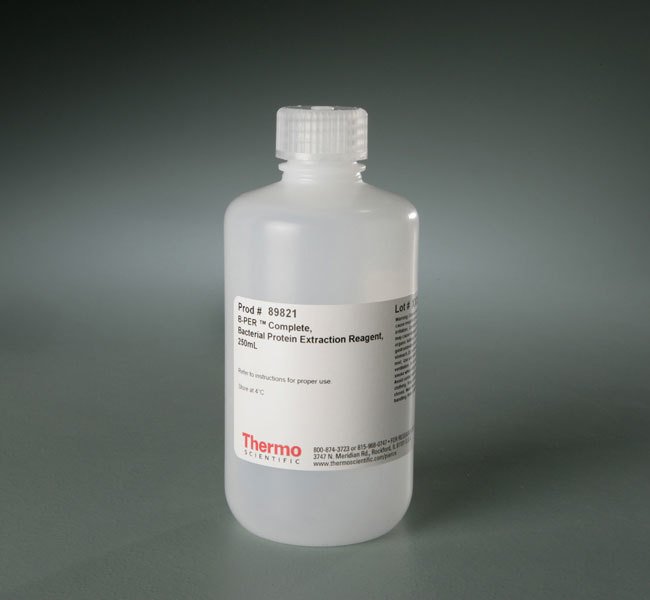 An easy-to-use cell lysis reagent that effectively disrupts cells and solubilizes native or recombinant proteins without denaturationAll B-PER Reagents are compatible with downstream applications such as affinity chromatography (e.g., immobilized metal affinity chromatography, glutathione chromatography), SDS-PAGE, and protein quantification (e.g., Pierce BCA Protein Assay, Pierce 660nm Protein Assay)This all-inclusive formulation combines the lysis reagent with lysozyme, and a universal nuclease to enable mild extraction from both gram-negative and gram-positive bacteriaDepending on the particular application protease inhibitors, salts, reducing agents, denaturants, and chelating agents may be added to the reagent.Features of the B-PER Bacterial Protein Extraction Reagent:Detergent in Tris buffer with Lysozyme and Universal NucleaseImproved cell lysis and DNA digestion, thereby releasing soluble proteins and reducing viscosity to increase yieldsRecovery of large molecular weight proteins (high MW proteins)Cost-effective equivalent to Merck Millipore Bugbuster™ Master MixMore effective than traditional sonication and typical homemade lysis buffers, many of which include detergents and components that interfere with downstream applicationsThis product(s) resides on a Fisher Scientific GSA or VA contract. If you are viewing this page as a nonregistered user, the price(s) displayed is List Price. To view your GSA or VA contract pricing, log in using your account number, or become a registered user by contacting one of our Customer Service teams. You can also view your contract price by searching for this item(s) on GSA Advantage. To place an order, contact Fisher Scientific Customer Service.