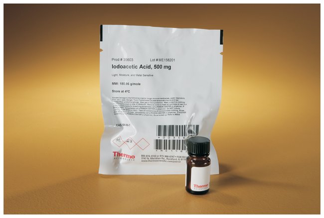 Get rapid carboxymethylation of reduced cysteine residues with Thermo Scientific™ Pierce™ Iodoacetic Acid and Iodoacetamide.Iodoacetic Acid (IAA) can react with several protein functional groups but is typically used for specific S-carboxymethylation of sulfhydryls (reduced cysteines).Iodoacetic acid reacts with sulfhydryls on cysteines, imidazolyl side chain nitrogens of histidines, the thioether of methionine and the primary amine group of lysines.The rate of reaction and specificity is dependent on the ionization level, which can be manipulated by the pH of the reaction condition.Highlights:React at slightly alkaline pH for specific S-carboxymethylation of free sulfhydrylsReact at low pH for specific carboxymethylation of methioninesReact at high pH to favor carboxymethylation of histidines and lysinesMethylate reduced cysteine peptide fragments in protease digests for mass spectrometry