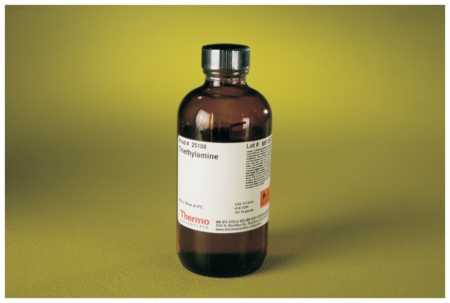 Bottles of 99.5%-pure TEA (MW 101.2, CAS 121-44-8) liquid (sold by weight); for HPLC use as an ion-pairing agent in reverse-phase peptide separations.