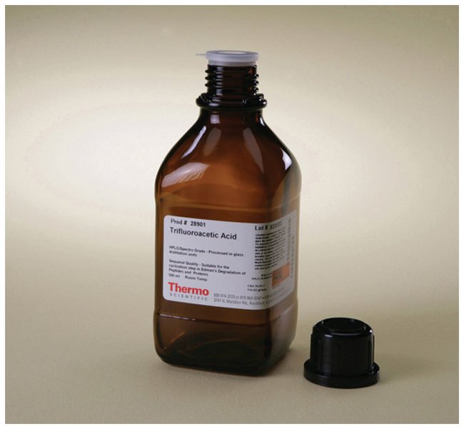 Bottles of 99.5%-pure TFA (MW 114.02, CAS 76-05-01) liquid (sold by weight); for HPLC use as an ion-pairing agent in reverse-phase peptide separations.