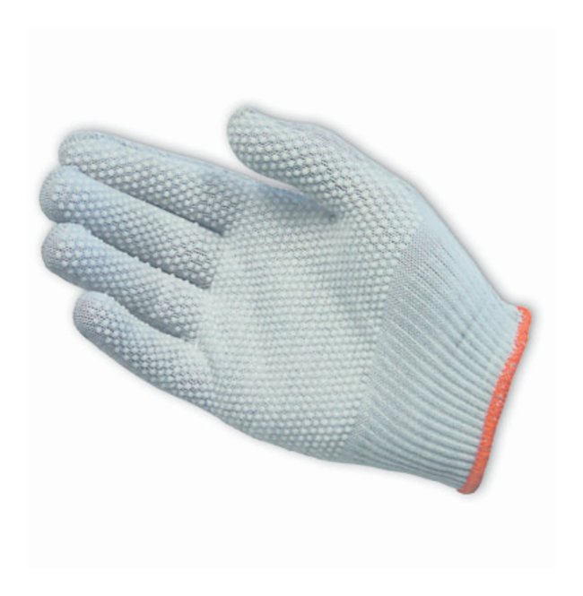 Electrostatic Dissipative (ESD) fiber yarns blended with low lint nylon reduce static build-up on the glove's surface for improved performance in electronics assembly. PVC dots enhance grip capabilities, and provide additional cut/abrasion resistance.