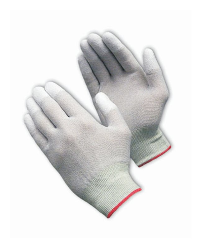 Electrostatic Dissipative (ESD) fiber yarns blended with low lint nylon reduce static build-up on the glove's surface for improved performance in electronics assembly. Polyurethane coating on the fingertips provides a secure grip in dry or slightly oily conditions.