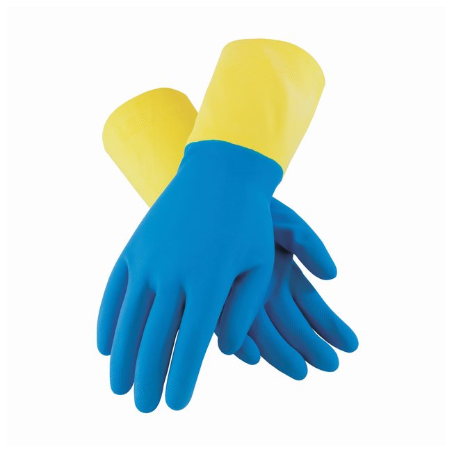 Double-dipped neoprene construction provides protection against a wide range of chemicals such as acids, caustics, solvents, and oils. Raised diamond pattern enhances grip capabilities in wet or oily conditions.
