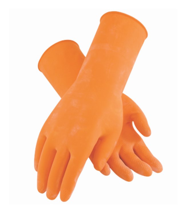 Unsupported, medium weight flock lined latex gloves with honeycomb pattern provide a secure grip when handling wet or slippery objects. Available in three colors blue, orange or pink.