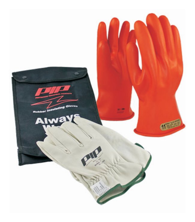 Kit includes one pair of natural rubber electrical insulating gloves (150-2-14), a pair of cowhide leather glove protectors (148-4000), and a 14 in. nylon glove bag.